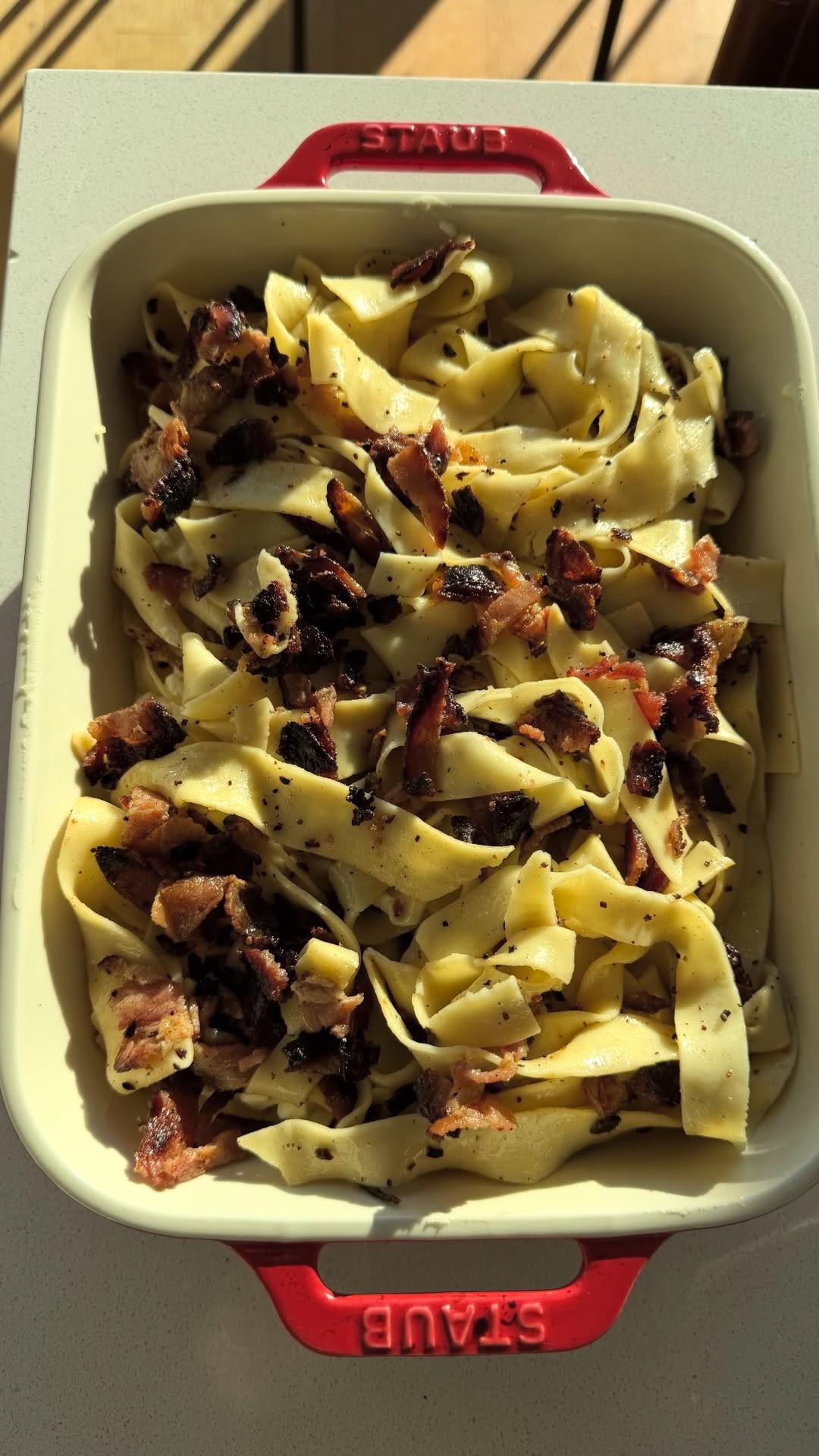 The noodles provide structure, while the cottage cheese gives creaminess and slight tang. Eggs bind everything together, and sour cream or yogurt adds moisture and richness.