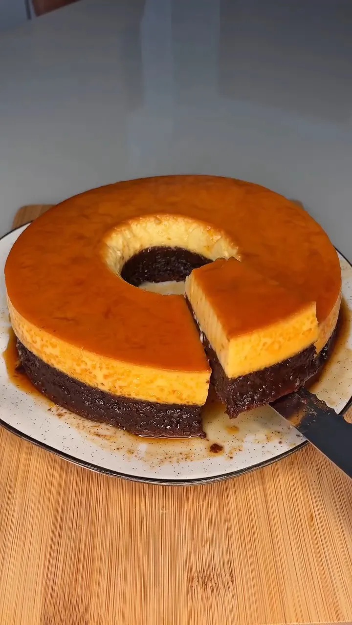 This natural layering effect gives bolo pudim its signature appearance and texture contrast: creamy, smooth pudding paired with soft, slightly dense chocolate cake.