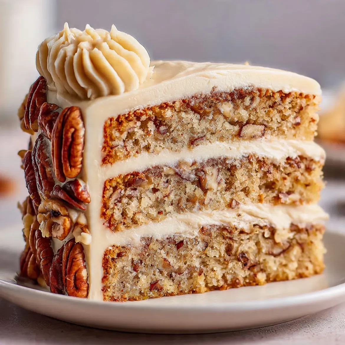 This cake is tender and buttery with a fine crumb, dotted with crunchy toasted pecans throughout. The frosting is rich yet silky, enhancing the nutty sweetness without overpowering the cake.