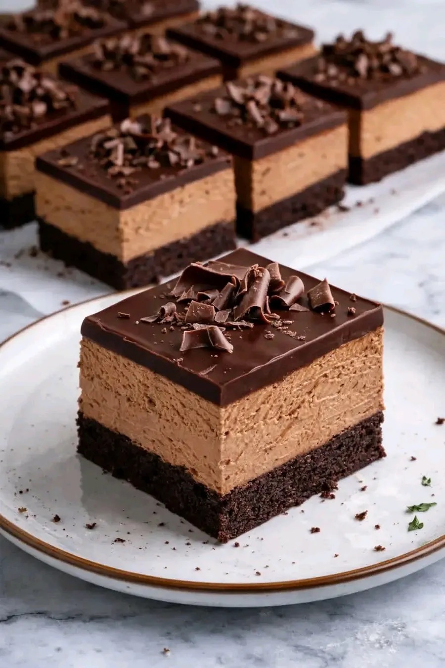 A Decadent Three-Layer Dessert with Brownie Base, Silky Mousse, and Glossy Ganache