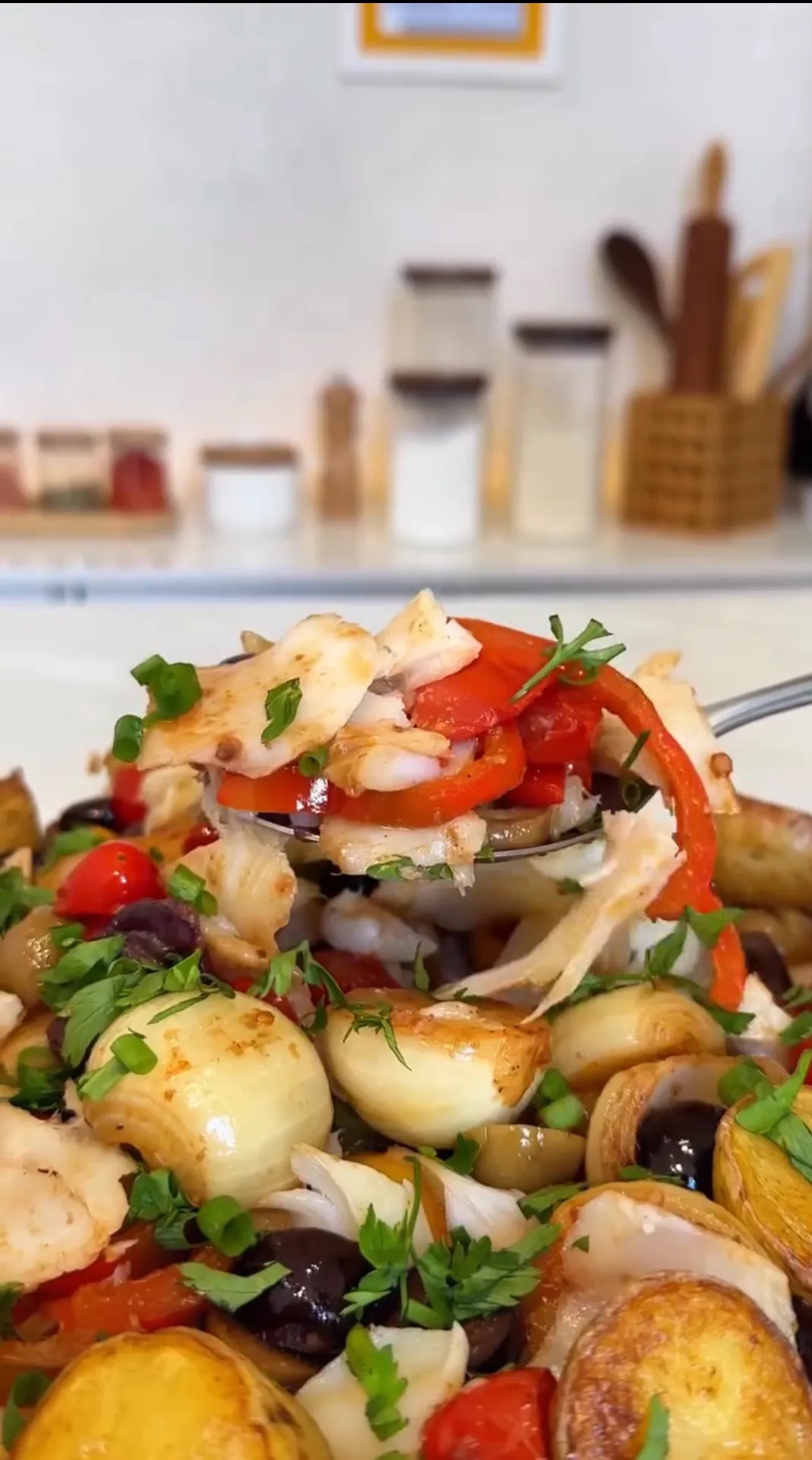 What makes this version special is its harmony: every ingredient plays an important role, yet nothing overpowers the others. The cod provides richness and depth, the vegetables add freshness and texture, and the olive oil ties everything together into a smooth, flavorful salad that can be served warm, chilled, or at room temperature.