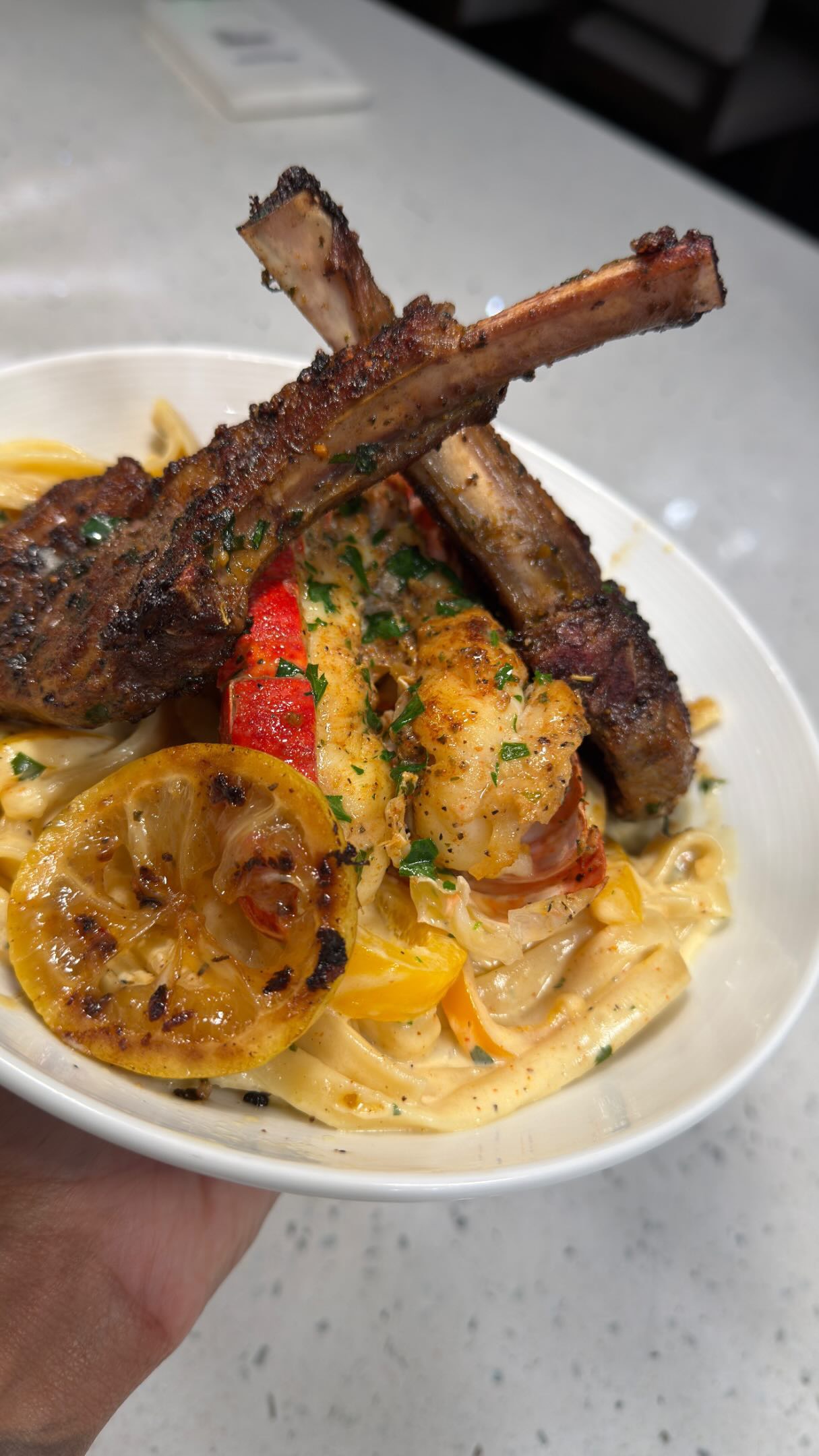 Creamy Lemon Garlic Seafood Pasta with Grilled Lamb Chops