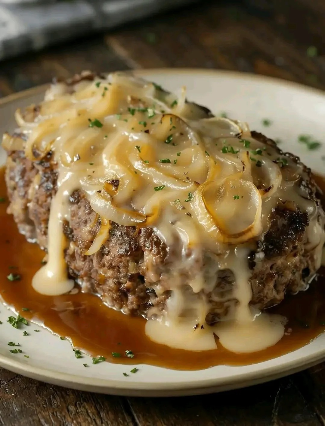 The image above showcases a beautifully baked meatloaf topped with golden caramelized onions and a blanket of melted cheese, resting in a pool of savory sauce. It is the kind of dish that feels both homely and elegant, perfect for family dinners, gatherings, or even special occasions.