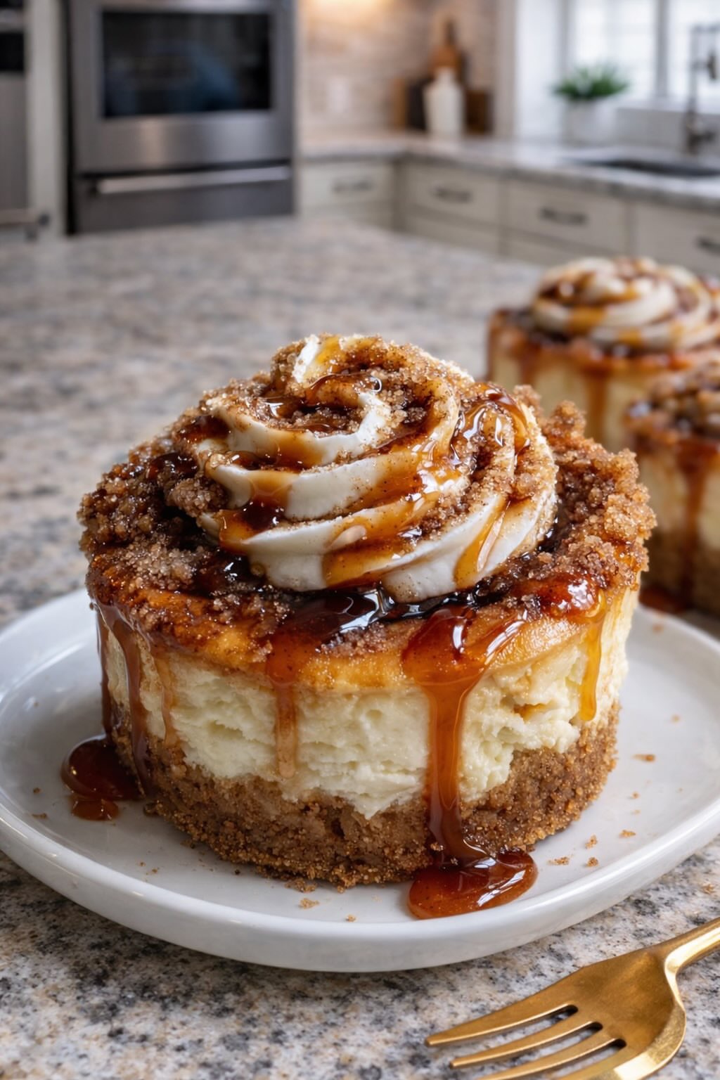 This creates the signature cinnamon roll pattern on top of the cheesecakes.