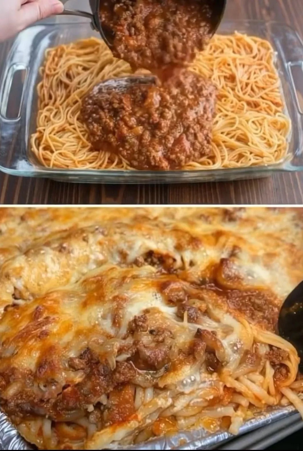 4. Pour the meat sauce evenly over the top layer of spaghetti.