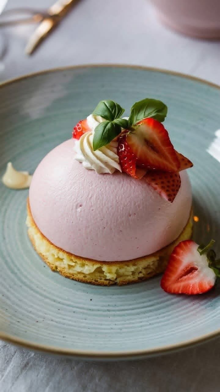 Strawberry and basil mousse domes are an elegant, modern dessert that impresses both visually and in flavor. They combine the sweetness of fresh strawberries with the freshness of basil, the creaminess of whipped mousse, and the delicate texture of sponge cake.